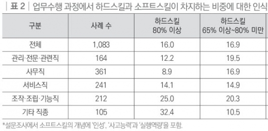 직종별로는 ‘서비스직’에서 ‘소프트스킬 65% 이상’이라고 응답한 비율(37.7%)이 가장 높았고, ‘조작·조립·기능직’의 경우 ‘하드스킬 65% 이상’이라고 응답한 비율이 45.3%로 가장 높았다.
