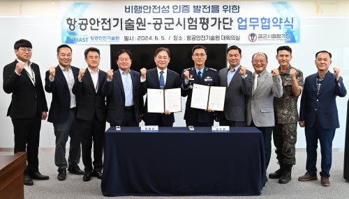 민간항공기·공항·항행시설·경량항공기·초경량비행장치 등에 대한 안전성·성능 등을 시험하고 인증하는 항공안전기술원(원장 이대성)이 지난 5일 공군시험평가단(단장 공두완)이 항공기·비행장치 인증 분야의 민·군 상호협력을 강화하기 위해 협약을 맺었다.
