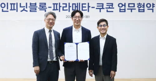 지난 30일 열린 협약식에는 김종현 쿠콘 대표와 정구태 인피닛블록 대표, 김종협 파라메타 대표를 비롯한 3사 주요 관계자들이 참석했다.