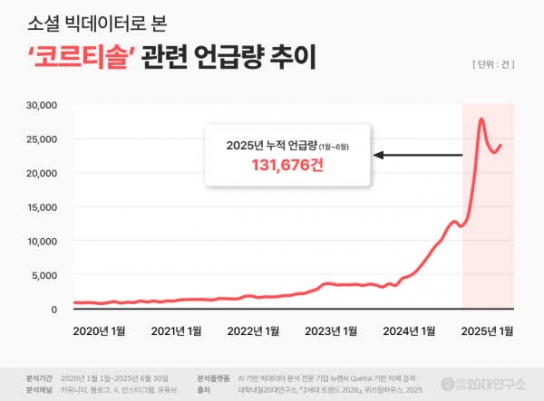 Z세대는 감정을 객관적으로 분석하는 것에서 나아가 감정 관리를 위한 생활 습관에도 적극적인 모습을 보인다. 특히 산책과 격불, 뜨개질 등 여가 활동과 수면 관리를 통해 감정을 다스리는 모습이 지속적으로 나타나고 있다. ‘스트레스 호르몬’으로 알려진 코르티솔에 대한 관심도 눈에 띈다. 소셜 빅데이터 분석 결과, 코르티솔의 2025년 상반기 누적 언급량(13만 1676건)은 2024년 누적 언급량(9만 2540건)을 1.5배 상회했다. 코르티솔의 연관어로는 관리·유지 맥락의 키워드가 두드러졌으며, 특히 ‘루틴(1300%)’과 ‘삶의 질(1900%)’ 언급량이 폭증했다. 과거 질환이나 치료의 영역에서 주로 언급되던 코르티솔이 이제 스트레스 관리 및 삶의 질 개선을 위한 루틴의 요소로 인식되고 있는 것이다.