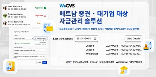 WeCMS는 베트남 중견·대기업을 위한 통합 자금관리 솔루션이다. △베트남 은행 및 국세청과 연동해 매출·매입 관리 △실시간 자금 흐름 모니터링 △환율 및 은행 거래내역 조회 △법인카드 사용 내역 관리 △전자세금계산서 발행·조회 △ERP 연계까지 기업의 자금·회계 업무를 하나의 시스템에서 관리할 수 있도록 지원한다.