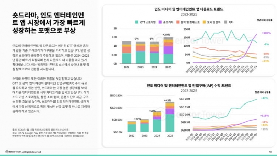 수익에서는 ‘소니 LIV’와 ‘아마존 프라임 비디오’가 선두를 유지하고 있으며, ‘지오핫스타’와 ‘ZEE5’가 뒤를 잇는다. 동시에 ‘드라마박스’, ‘릴숏’과 같은 숏드라마 앱도 수익 순위에 진입하며 새로운 수익화 가능성을 보여준다.