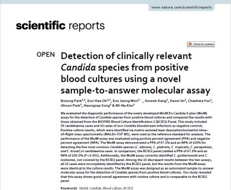 이번 연구에서 사용된 MoiM Dx100은 핵산 추출 및 증폭 시약이 포함된 올인원 카트리지 시스템을 채택해 검체 주입만으로 분자진단의 모든 과정을 자동화할 수 있도록 설계됐다. 이를 통해 의료 현장에서 단일 시료를 1시간 이내에 분석할 수 있으며, 4개의 형광 검출 채널을 갖춘 반응 체임버를 이용해 최대 16개의 유전자 동시 검출이 가능하다. 해당 장비는 2024년 5월 국내 식품의약품안전처(식약처)로부터 체외진단의료기기 인증을 획득한 바 있다.