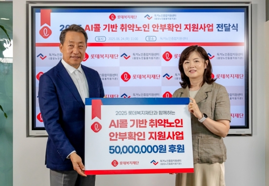 롯데복지재단(이사장 조한봉)은 지난 24일 서울 영등포구에 위치한 독거노인종합지원센터 4층 대회의실에서 ‘AI콜 기반 취약노인 안부확인 지원사업비 전달식’을 열고 서비스 운영에 필요한 사업비 5천만 원을 전달했다.