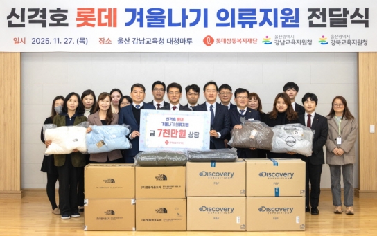 롯데삼동복지재단(이사장 장혜선)은 지난 27일 울산광역시 강남교육지원청 대청마루에서 ‘신격호 롯데 겨울나기 의류지원 전달식’을 갖고 울산 지역 중·고등학생 232명에게 겨울용 패딩을 전달했다.