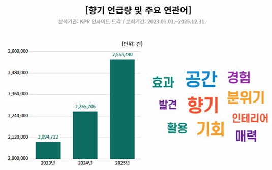 종합커뮤니케이션그룹 KPR(사장 김강진) 부설 KPR 인사이트 연구소는 온라인상 700만 건의 빅데이터를 분석한 결과, 향기에 대한 언급량이 2025년에 255만5000건으로 최근 3년 사이 20% 이상 증가했다고 밝혔다.