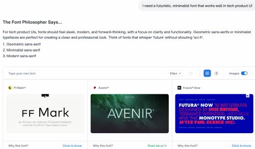 기존의 폰트 검색은 필터나 태그, 분류 기준을 선택하며 원하는 서체를 하나씩 찾아야 하는 방식이어서 시간이 많이 걸린다는 한계가 있었다. 모노타입의 ‘AI 서치’는 이러한 과정을 자연어 기반 검색으로 바꿔, 디자이너가 떠올린 무드(mood), 브랜드 성격, 스타일, 활용 목적 등을 문장으로 입력하면 그에 맞는 폰트를 찾을 수 있도록 돕는다.