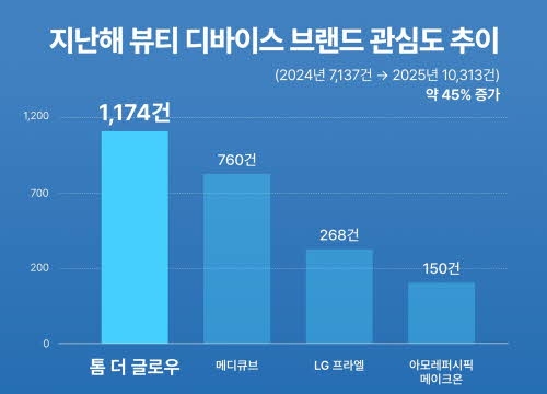 싱클리는 9일 지난해 뷰티 디바이스 주요 브랜드의 온라인 언급량(네이버 카페, 인스타그램, 유튜브 쇼츠, X 등에 게재된 포스팅 수)을 분석한 결과, 톰 더글로우가 총 1174건으로 가장 높은 관심도를 기록했다고 밝혔다. 뒤이어 APR 메디큐브 760건, LG전자 프라엘 268건, 아모레퍼시픽 메이크온 150건 순으로 나타났다.