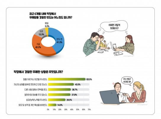 설문에 참여한 직장인 315명의 응답에 따르면 직장 내 무례함을 ‘매일 경험한다’가 3.2%, ‘자주 경험한다’가 13.3%, ‘가끔 경험한다’가 42.2%로 일상 직장 생활에서 반복적으로 무례함을 경험한다는 응답자가 58.7%에 달했다. 나머지 41.3%는 6개월 이내에 한두 번 무례함을 경험한 적이 있다고 답했다.